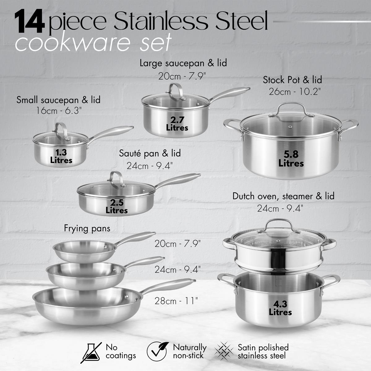 • Complete 14-Piece Set – Includes everything you need: pots, pans, lids, and utensils—no need to buy separately